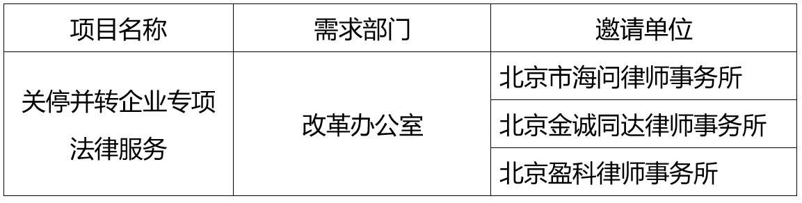 按照《中國標(biāo)準(zhǔn)科技集團(tuán)有限公司采購工作管理辦法(試行)》要求,現(xiàn)對“關(guān)停并轉(zhuǎn)企業(yè)專項(xiàng)法律服務(wù)”相關(guān)事項(xiàng)處置法律服務(wù)項(xiàng)目競爭性談判邀請單位進(jìn)行公示。